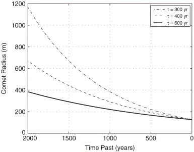 Figure 5- comet radius (m) and time of impact (years) accounting for different methane lifetimes (Atreya et al, 2007). The comet would need to deliver a set amount of methane that would degrade to current observed values of 10ppbv.