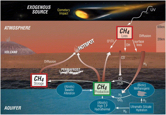 It is hypothesised that microbial colonies could exist in aquifers beneath the permafrost on Mars and they’d be able to utilise CO (700ppmv) and H₂ (40-50ppmv) that has diffused through the regolith into the aquifers to fuel their metabolism and released methane as a by-product (Atreya and Gu, 1994). If the methane is indeed of biological origin (produced by methanogens) then the microbial colony would need to be fairly small due to the relatively low concentrations of methane observed. There may also exist organisms that utilise this produced methane as an energy source as well (Methanotrophs). This would provide another mechanism by which methane could be removed from the atmosphere. This method could also be used to explain the spatial variation seen in the methane observation, which other methods cannot fully explain (Atreya et al., 2007).