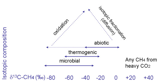 This is confirmed by Etiope, 2018, who states that the isotopic composition doesn’t necessarily indicate the origin of the Martian methane fully. For instance, micro-organisms can produce methane that is ¹²C depleted and can have an isotopic composition that resembles that of thermogenic gas. Drake et al, looked at stable isotopic analysis of calcite precipitated in bedrock fractures and found a staggering variability in the carbon isotopes in the calcites with values of δ13C spanning as much as -93.1‰ (related to anaerobic oxidation of methane) to +36.5‰ (related to Methanogenesis). This shows that microbial process can create very different isotopic signatures, even on Earth in terrestrial bedrocks (Drake et al., 2017). Figure 6 shows a summary of all the possible values associated with each potential origin pathway, there is considerable overlap and uncertainty concerning these values. Post-genetic alterations can also greatly modify the isotopic composition of methane gas (as seen in figure 6). They mention another pathway in which this change can occur by mentioning oxidation by hydrogen peroxide in the regolith which can increasing the proportion of ¹³C in the molecule, essentially turning the “biotic” signature into an “abiotic” signature, obscuring the molecule’s true origin. Furthermore, isotopic fractionation during diffusion in low permeability rocks can lead to ¹²C enrichment in the released gas, giving the gas a “microbial” signature (Etiope, 2018).