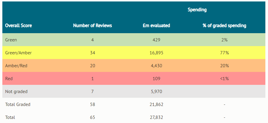 Furthermore, whilst we’re discussing using the scientific method to advance human wellbeing I think now is a good time to actually evaluate how much value for money we get from our foreign aid spending, as there seems to be this idea that foreign aid is mostly wasted, or is even counter-productive. The Foreign, Commonwealth and Development Office (FCDO) is a remarkably transparent government department with projects been independently assessed for efficacy by 3rd parties. For example, The UK is one of the few countries to independently scrutinise its aid spending. This is done through the Independent Commission for Aid Impact (ICAI) which is an independent body reporting to Parliament. The ICAI assesses aid programmes and releases a report and the Centre for Global Development aggregated all these reports. Overall, 79% of all aid programmes where found to have a positive impact with only 20% needing significant improvement. This can be seen in figures 7 and 8 shown below which show the grades achieve by different foreign aid programmes.