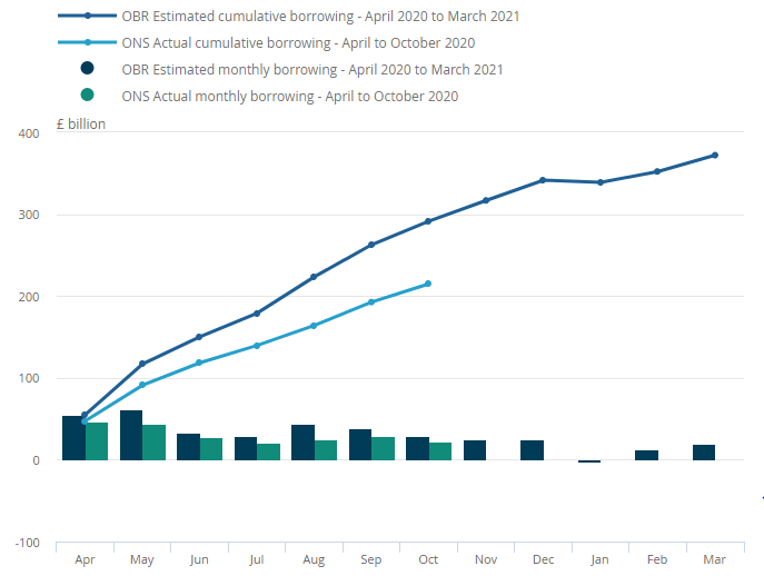 This seems bad, which it is, but not as bad as it may seem at first glance. Firstly, the interest rate at which the UK government can borrow money is at historic lows, meaning the government can borrow money very cheaply. For example, a UK government bond with a maturity of 20 years has a yield of 0.83% (as of December 2020). Secondly, the ONS is consistently revising down projected government borrowing. Figure 5 shows projected and actual government borrowing from April to October 2020. It shows that actual borrowing is consistently lower than projected borrowing.