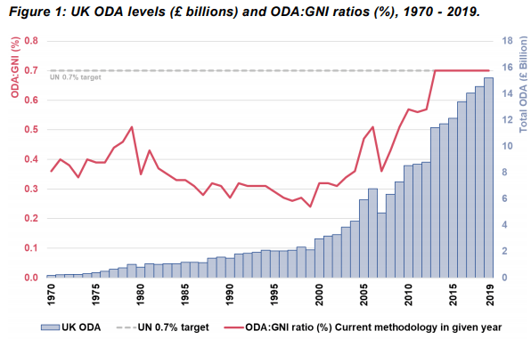 The Foreign, Commonwealth and Development Office (FCDO) is a surprisingly transparent government department. In 2019, it released a report detailing how much it spent and how where that money went. Currently, and since 2013, the foreign aid budget is 0.7%; this represented approximately £15.2 billion in ODA (Official Development Assistance) spending in 2019. Figure 1 summarises historical and current levels of ODA spending.