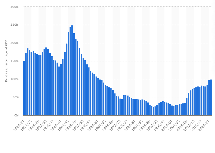 Furthermore, the percentage of debt to GDP is hovering around 100% currently. While this is not good, it peels in comparison to what it has reached historically. Figure 6 shows historic levels of debt to GDP percentages. The position we find ourselves is not unique in our history.