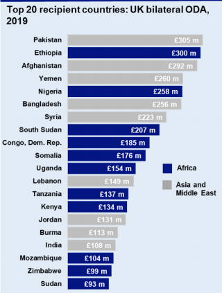 Finally, the bulk of bilateral ODA spending went to Africa or Asia. Bilateral ODA comprises 67.5% of overall ODA spending. Figure 3 below breaks down bilateral ODA spending in 2019 by region. Figure 4 expands on this by showing the top 20 countries by how much ODA spending they received in 2019.