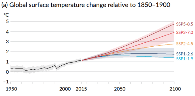 Figure 3- Graph showing several different SSPs (Shared Socioeconomic Pathways) of how temperature may increase over the course of this century.