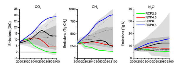 The RCPs were to model potential pathways to different levels of radiative forcings or change in build-up of energy in the Earth’s atmosphere. They were to focus on future GHG concentrations that could be used as inputs into future climate models. Four different radiative forcings were selected- 2.6, 4.5, 6.0 and 8.5 (W/m2). The modellers chose these specifically as they wanted to span the range of potential emissions and concentrations projected in the climate literature, but they also needed to be distinct enough from one another. However, the SSPs were not developed in time for integration for AR5 in 2013.