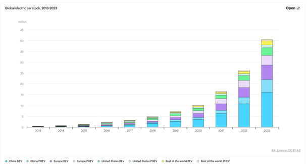 - The progress we have made is hard-won and I don’t believe we will slip backwards. I believe the current trajectory we are on (~2.7⁰C) is the worst-case scenario and if things change, they will most likely change for the better, meaning faster emissions reductions and adoption of new technology. Why do I think this when there is resurgent populist spirit growing around the developed world (Donald Trump recently won the American Presidency)? It’s because investment into renewable and low carbon technologies are at record high with $1.7 trillion dollars invested globally in 2023 compared to the $2.8 trillion invested in energy globally overall, out investing fossil fuels and the gap continues to widen and the electric car stock continues to grow healthily.
