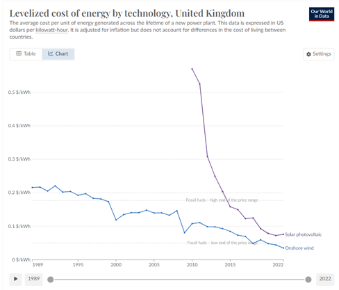 Figure 8- OurWorldInData graph showing levelised cost of energy of PV solar and onshore wind against fossil fuels in the UK.