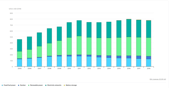 Figure 9- Graph showing investments in fossil fuels, nuclear energy, renewable energy, battery storage and electricity networks.