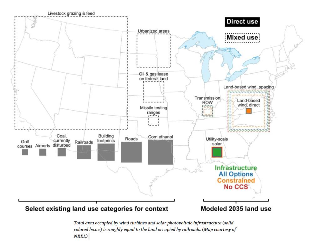 However, this can seem quite misleading as this assumes that this land is only used for energy generation. In fact, most of the land utilised for wind generation can have a dual-purpose including agriculture and grazing. Offshore can use larger turbines requiring less total area. Additionally, solar energy can be placed on less desirable land such as brownfield sites and abandoned mining sites, lowering the opportunity (what alternative use is there for this land). Also, rooftop solar has the additional benefit of being placed on land that is already being utilised. A report released in 2022 calculated the total amount of land required to power 80% of the USA’s electricity demand from zero carbon sources by 2023 and 100% by 2035 and found it would require approximately 19,700 square miles of wind farms, solar and long-distance transmission lines.